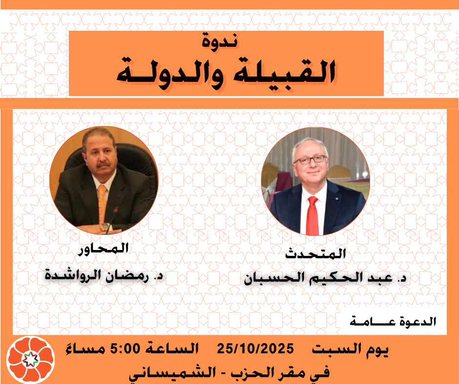ندوة بعنوان القبيلة والدولة للدكتور عبدالحكيم الحسبان يحاوره الدكتور رمضان الرواشدة السبت المقبل